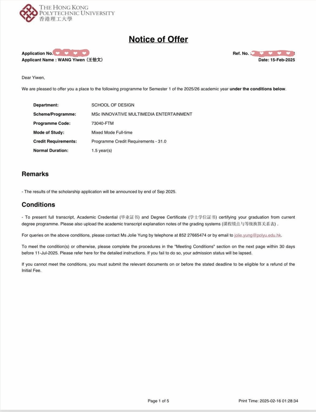 热烈祝贺我校2021级人工智能艺术学院数字媒体艺术专业学生王*文、敬*,设计艺术学院艺术设计学专业学生余*一通过我校与香港理工大学“4+1”遴选,成功斩获该校“多媒体创娱”理学硕士录取资格,成为2025年该项目录取学生!