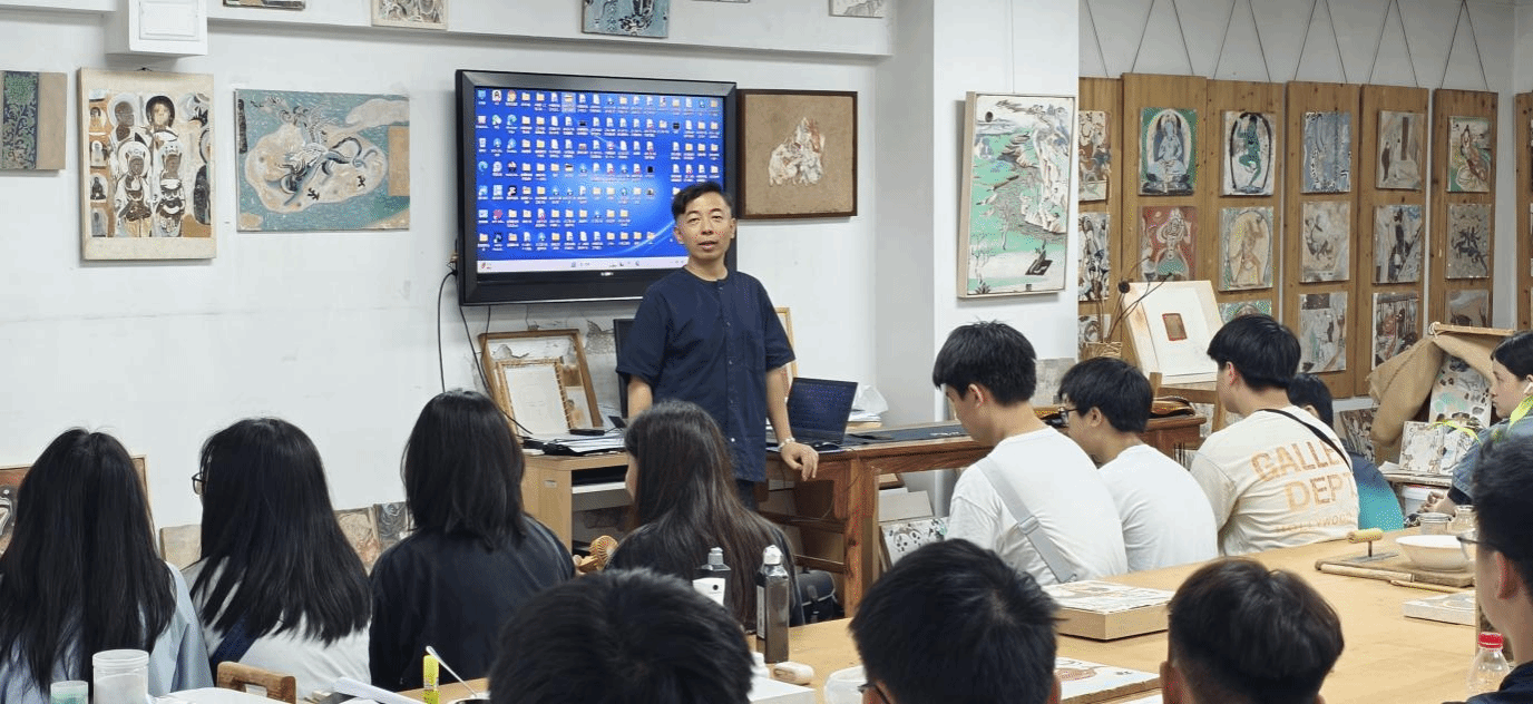 最后,交流团参观了我校的美术学国家级实验教学示范中心—中国画实验室(重彩壁画实验室)。赵栗晖教授向同学们介绍了天美师生在敦煌实地考察的经历以及敦煌壁画对当代中国画创作的影响与启示。在这里,学生们近距离欣赏了敦煌壁画的精髓,详细了解了古代壁画矿物颜料以及泥坯结构等传统工艺。同学们纷纷表示,这种沉浸式的艺术体验让他们在内心种下了一颗敦煌的种子,对中华传统文物的保护与传承有了更深的认识。