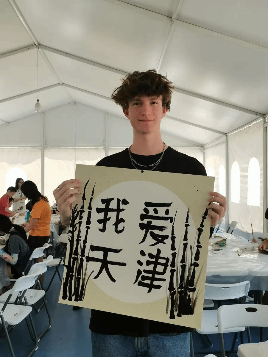 书法课程由我校优秀研究生毕业生艾根指导。她从最基础的执笔姿势教起,耐心示范横竖撇捺的运笔要领,指导学生们完成“我爱天津”四个字的书写。来自纽约的詹姆斯同学举着自己略显稚嫩却充满诚意的作品,兴奋地说:“虽然我的字写得歪歪扭扭,但写'天津'时感觉特别亲切,像是在交新朋友。”
