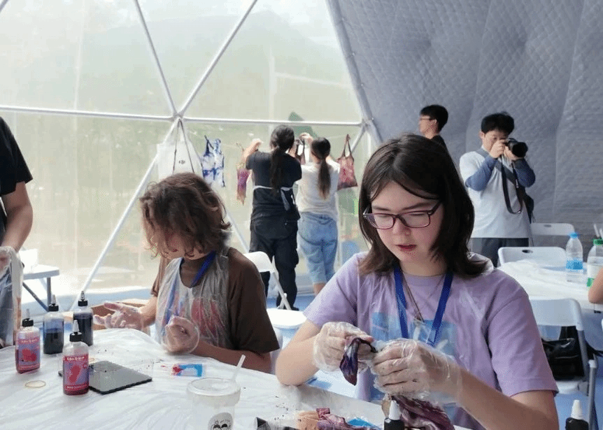 天津美术学院设计艺术学院刘娜教授、美术教育学院外聘教师王少桓以及我校优秀毕业生为中美青少年精心设计了扎染、烧箔画、团扇绘画、书法四项传统技艺研习课程。在扎染创作区,刘娜教授亲自示范了传统绞缬技法,指导学生们将白布通过捆扎、缝缀等方式制作防染图案。来自美国伊利诺伊州的艾米丽·威廉姆斯同学在完成一幅融合中国云纹与现代几何图案的靛蓝扎染作品后激动地表示:“这种通过物理防染创造出独特纹理的工艺太神奇了,每一件作品都充满惊喜,让我感受到了中国手工艺的智慧与魅力。”