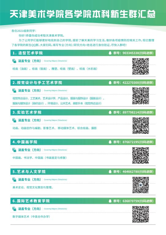为了让同学们能够更好地找到自己的学院,提前了解天美的学习生活,做好各项疫情防控相关工作,现已整理了各学院的新生QQ群,大家扫码,填写专业(方向)/研究方向+姓名进行身份验证,尽快入群吧!