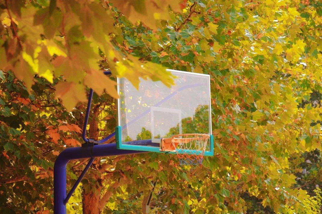 青紫色篮球架藏在斑斓的叶子中